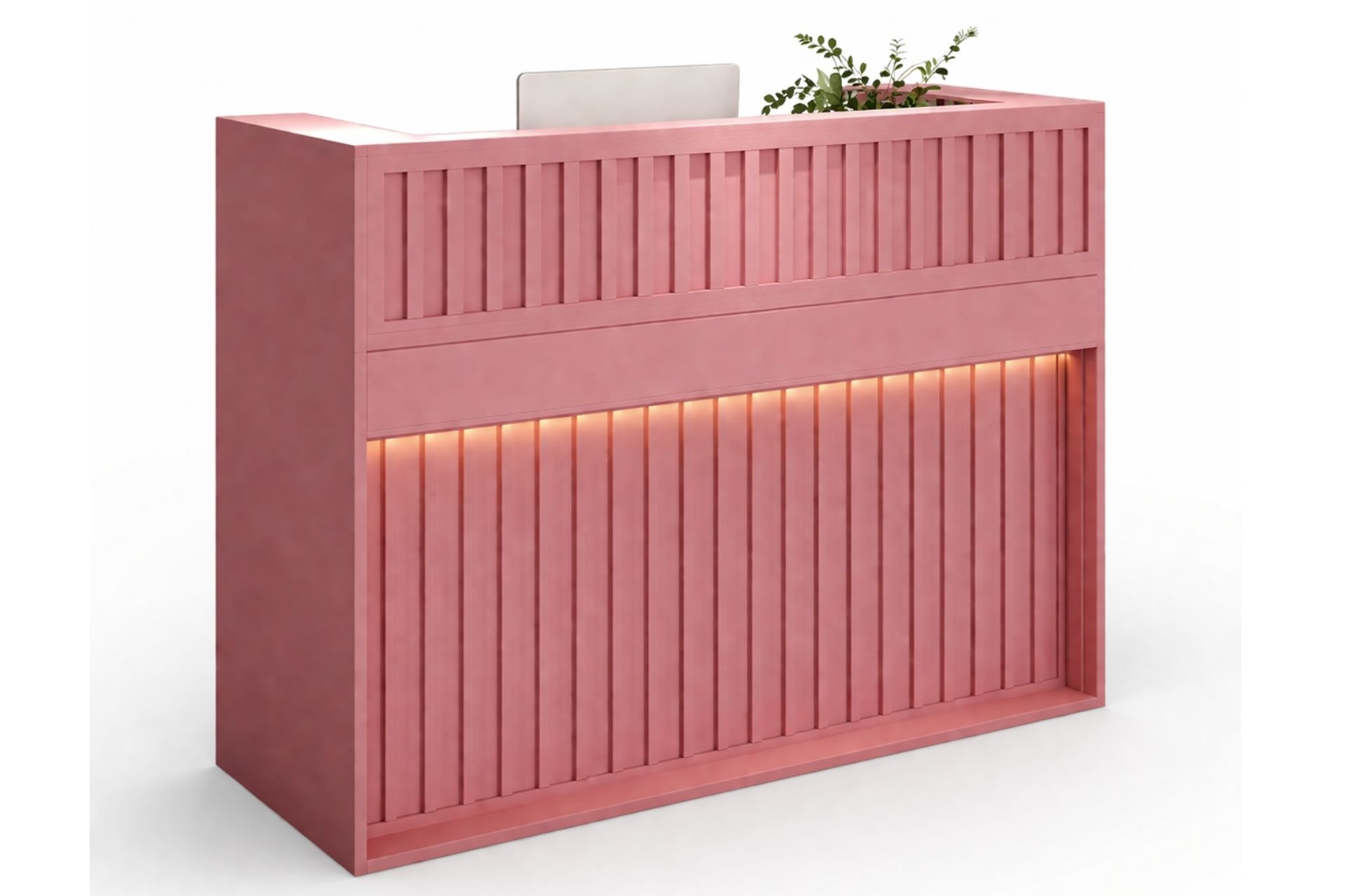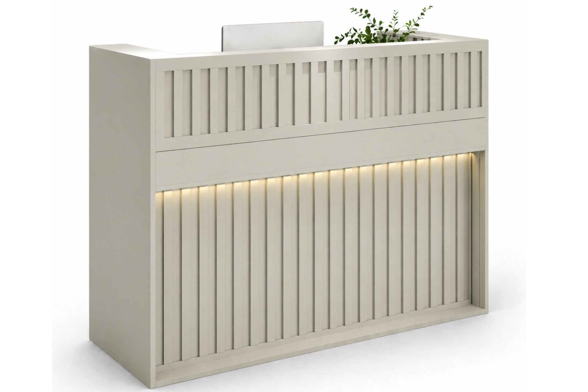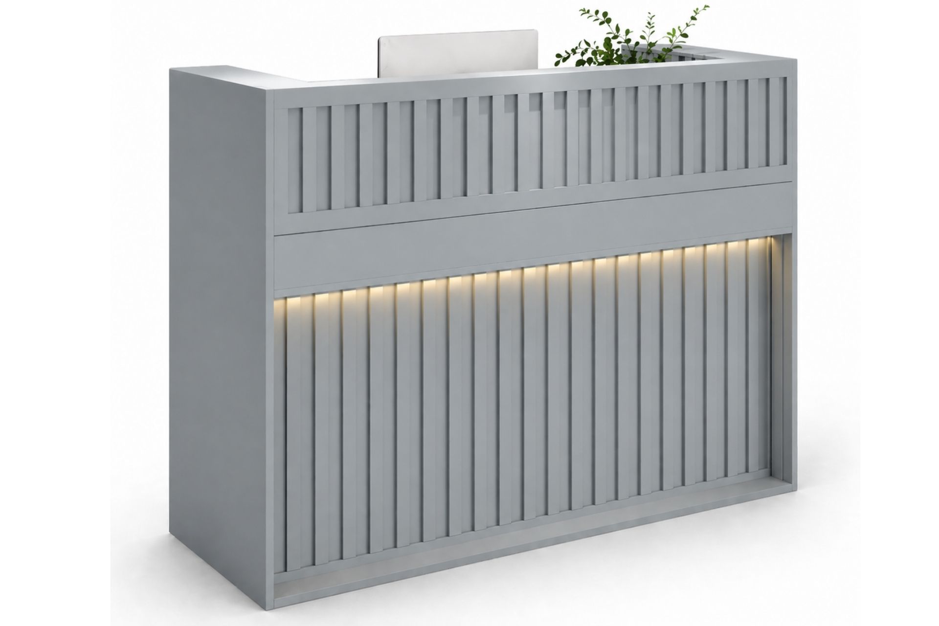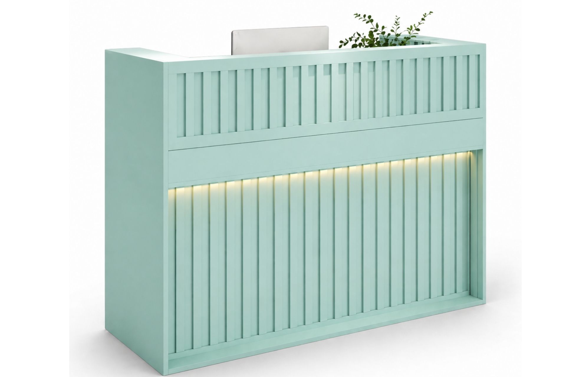 Lake boyalı cilalı yüzeyi sayesinde istenilen renkte üretilebilen Mini Ofis bankosu, modern dikey panel tasarımıyla mekâna estetik bir görünüm kazandırır.