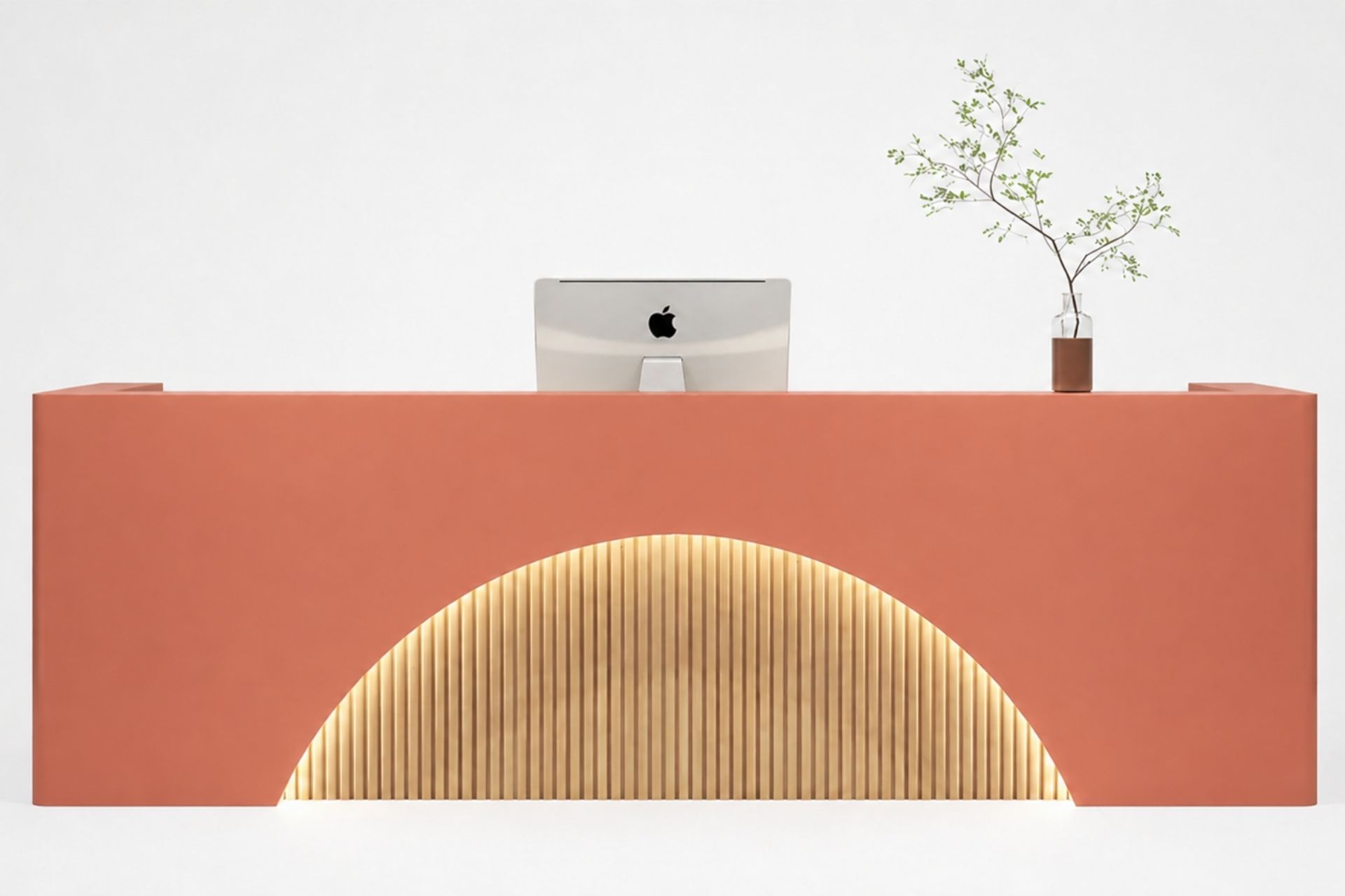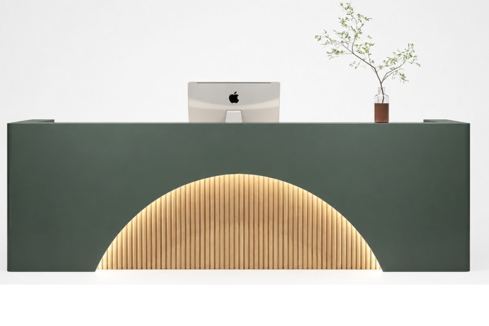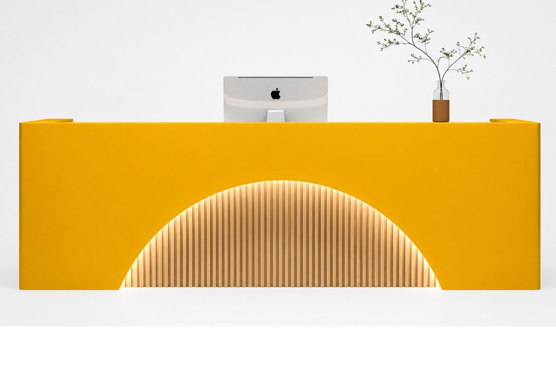Modern çizgisi ve güçlü duruşuyla dikkat çeken bu resepsiyon bankosu, giriş alanlarına prestijli bir görünüm kazandırır. Yarım daire formundaki LED aydınlatmalı ön panel, mekâna sıcak ve davetkâr bir atmosfer katar.